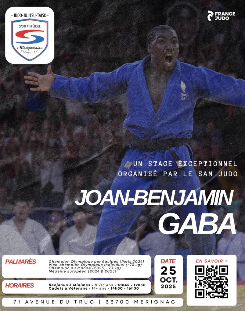 Envie de poursuivre votre progression pendant ces vacances de la Toussaint? La section judo du Sport Athlétique Mérignacais vous en offre la possibilité avec un stage dirigé par Joan-Benjamin Gaba le 25 octobre prochain. Deux créneaux sont proposés : pour les benjamins-minimes de 10h45 à 12h30, puis à partir des cadets de 14h30 à 16h30. Une occasion unique de suivre les conseils du champion du monde 2025 des -73kg.