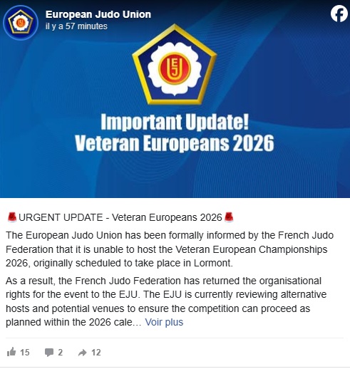 L’information vient de tomber sur la page Facebook de l’Union européenne de judo (UEJ) : les championnats d’Europe vétérans qui devaient être organisés au PAMM de Lormont (Gironde) du 18 au 21 juin, n’auront finalement pas lieu en France.